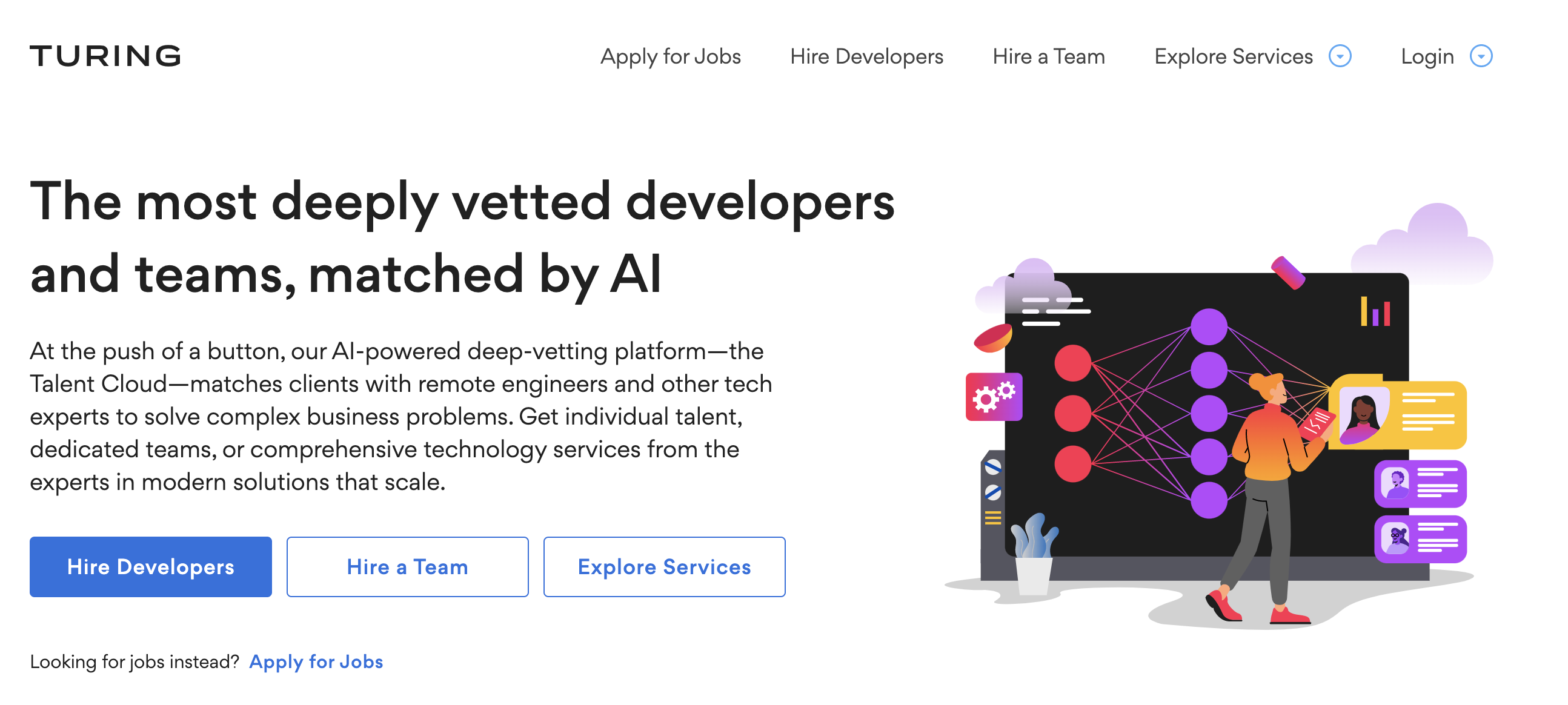 Turing.com is a platform that connects businesses with top remote software developers from around the world. The platform leverages AI to match companies with the best talent for their specific needs. Turing.com's developers are rigorously vetted, with only the top 1% of applicants being accepted.