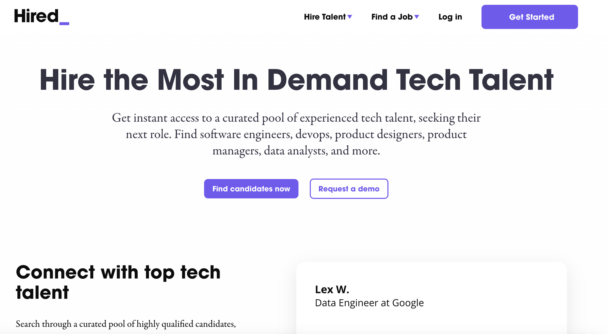 Hired.com is a hiring platform that connects businesses with top tech talent from around the world. The platform offers a range of services, from full-time employees to contract engagements, and provides tools to help businesses manage their hiring process. Hired.com is trusted by businesses of all sizes and industries, and offers a range of developers with expertise in a variety of programming languages and technologies.
