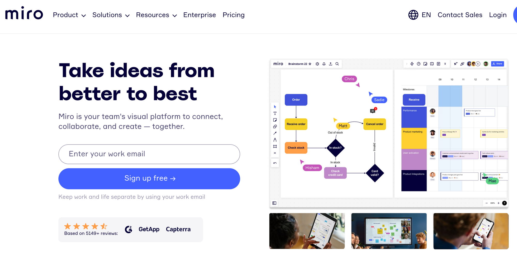 Miro.com is a collaborative online whiteboard platform that allows teams to work together in real-time. The platform offers a range of tools, including templates, widgets, and integrations, to help teams collaborate on projects, brainstorm ideas, and visualize workflows. Miro.com is used by teams of all sizes, from startups to Fortune 500 companies, to improve their productivity and streamline their workflow.