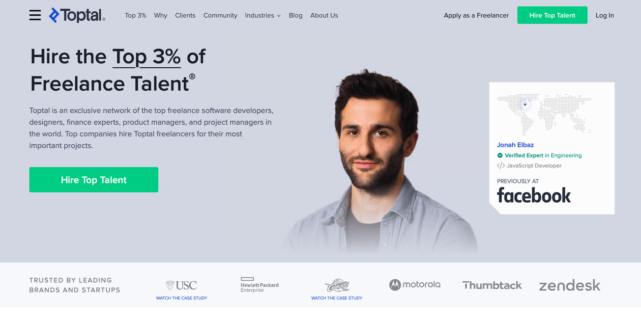 Toptal stands out in the crowded field of freelance platforms by rigorously vetting its talent, ensuring that only the top 3% of applicants make the cut. This elite selection process guarantees that businesses gain access to professionals with proven track records and exceptional skills in software development, design, finance, project management, and more.